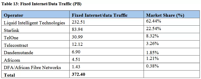 Starlink held the second largest share of fixed Internet/data traffic, following Liquid Intelligent Technologies (62.44%) and TelOne (8.32%).
