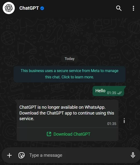 ChatGPT is no longer available on WhatsApp. Download the ChatGPT app to continue using this service.